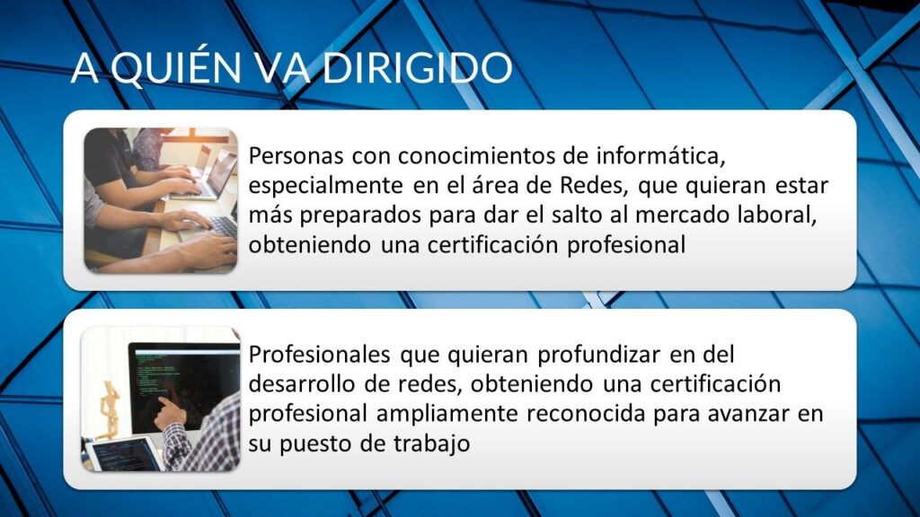 Lo importante es tu pasión en este sector. Teniendo en cuenta que el objetivo del Máster es profundizar en el desarrollo de redes y la preparación de las certificaciones CISCO 200-301, CyberOps 200-201 y Fortinet Certified Security Operations, es necesario tener conocimientos de informática, especialmente en redes que te capaciten para poder tener las bases para afrontar el Máster con garantías. Puedes haber obtenido dichos conocimientos bien de forma autodidacta, bien a través de una formación como ASIR o STI, Certificados de Profesionalidad en informática o similares.